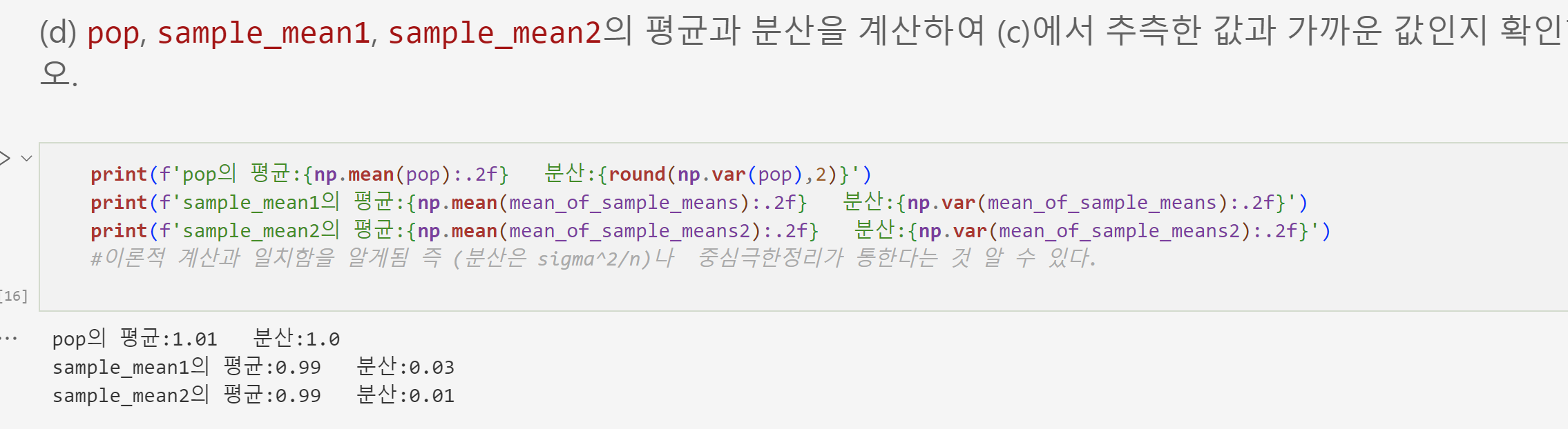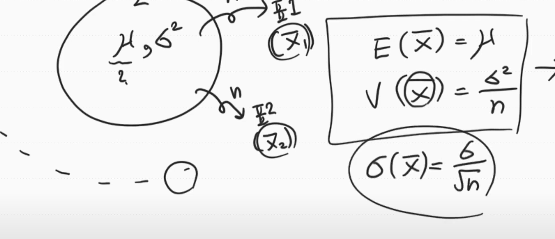 분산은 모집단의 분산을 n으로 나눈 것 표준편차는 모집단의 표준편차를 루트n으로 나눈것과 같다.