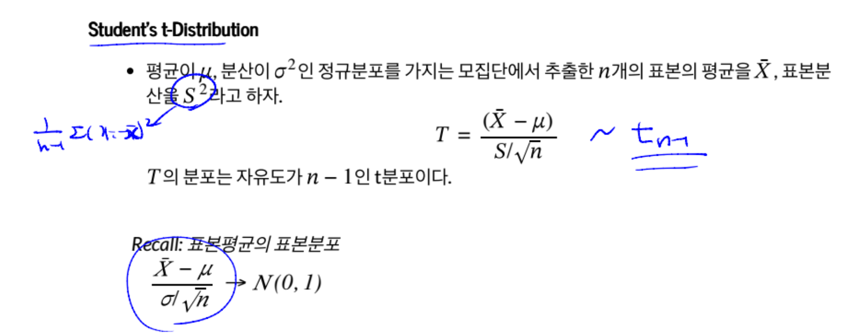 그래서 시그마 대신 그 자리를 S(표본의 표준편차 n-1)로 대체한다면 이는 정규분포가 아닌 t분포를 따르게 된다는 것이다.