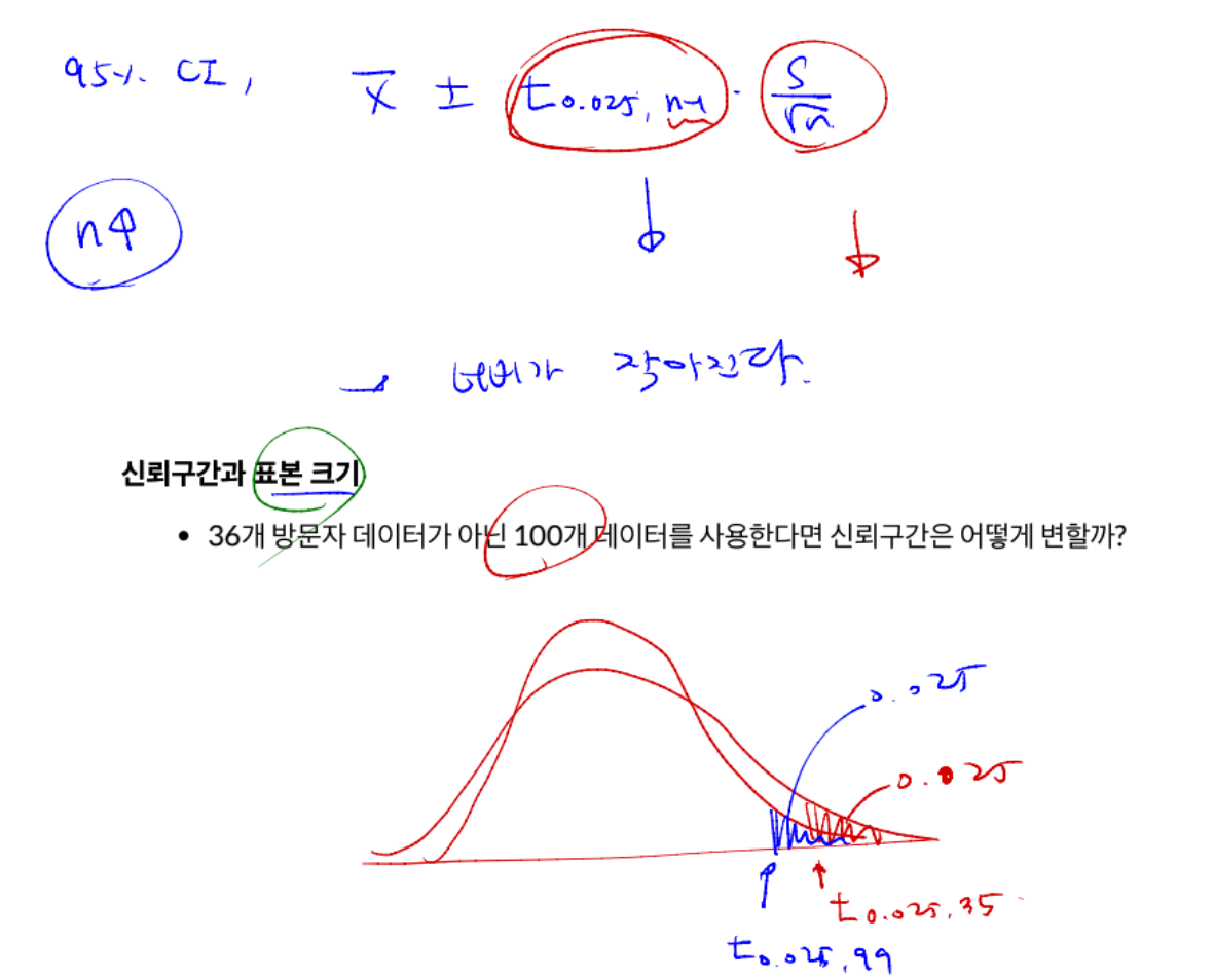 위의 공식 신뢰구간 구하는 공식 ! 옆에 자유도도 같이 쓴다. 자유도 값에 따라 달라짐으로