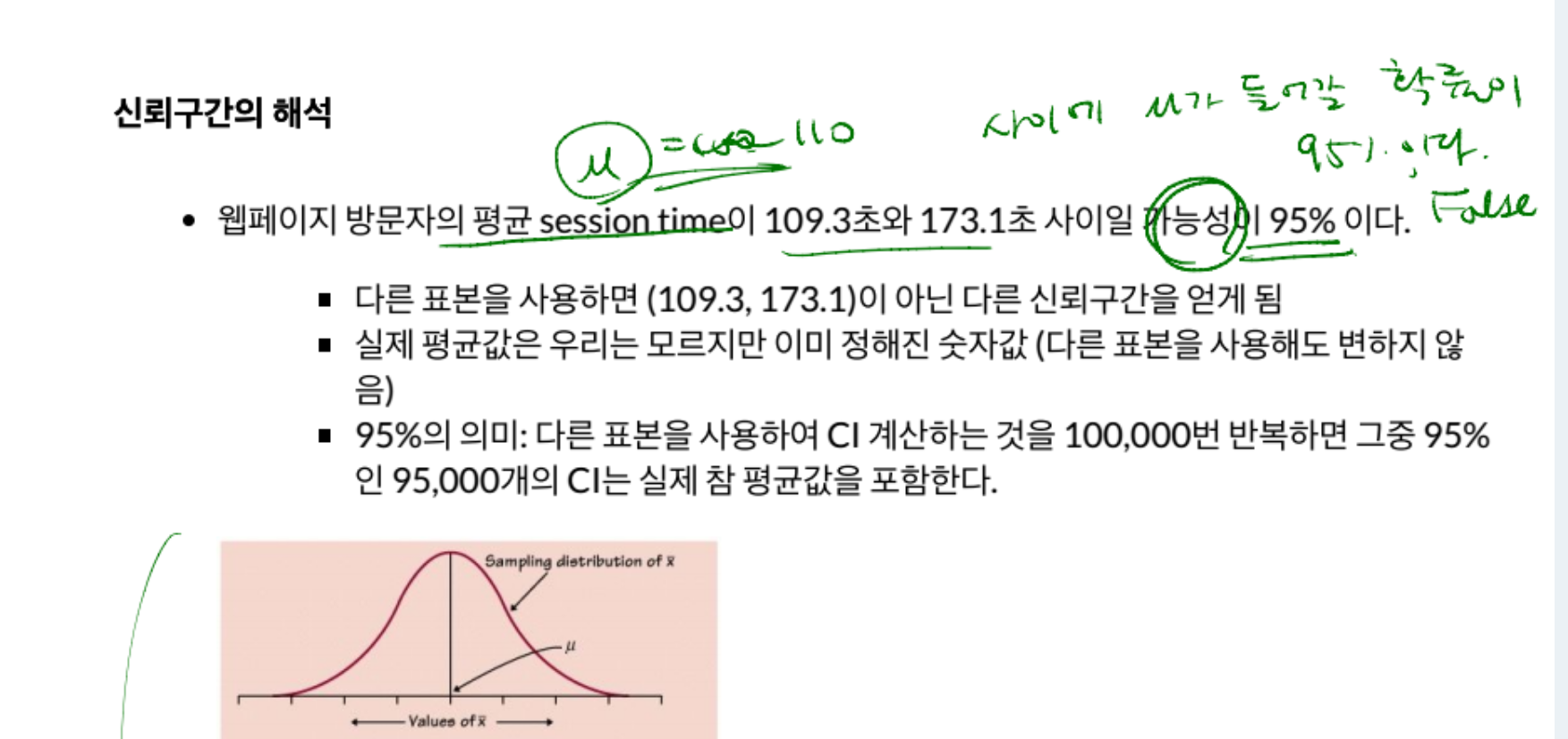 109.3초와 173.1초 사이에 뮤가 들어갈 확률이 95%라는 말은 false 이다.