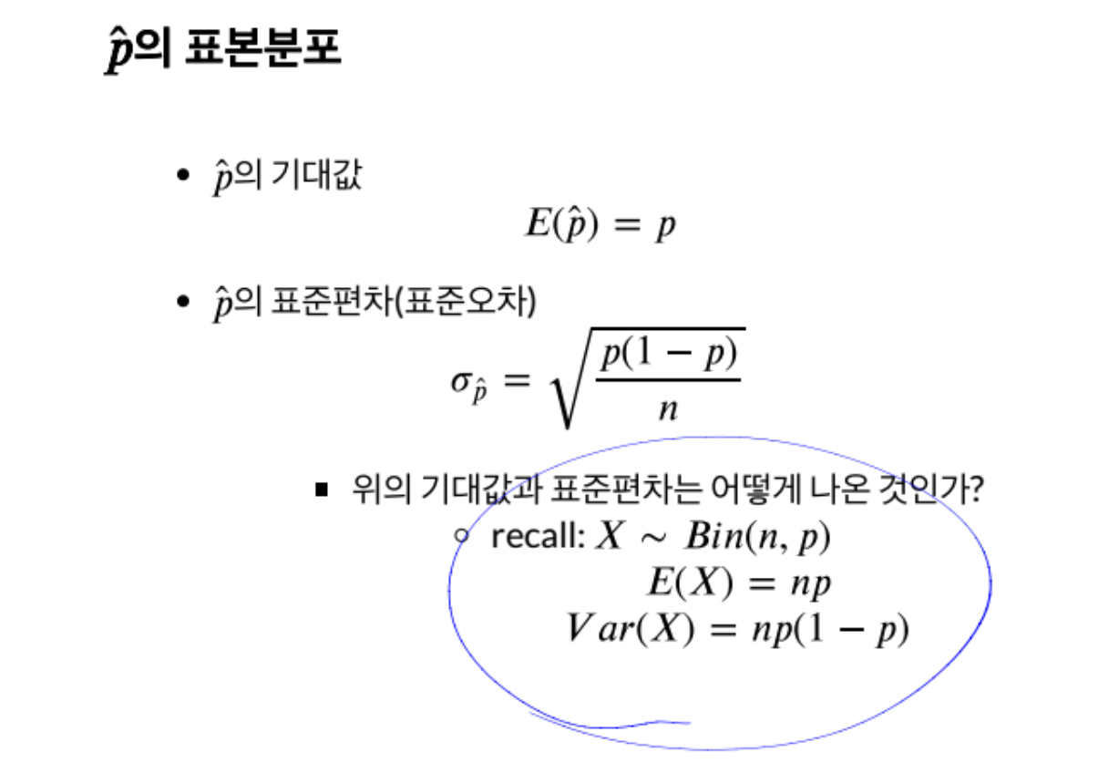 알고싶은 것은 X의 비율이고 따라서 x/n 을 알고싶다. 평균의 경우 상수는 그대로 나오기에 1/n이 나오고 그래서 1/n 곱하기 이항분포의 평균인 np를 곱하게 되고 따라서 p^의 기댓값이 P가된다.