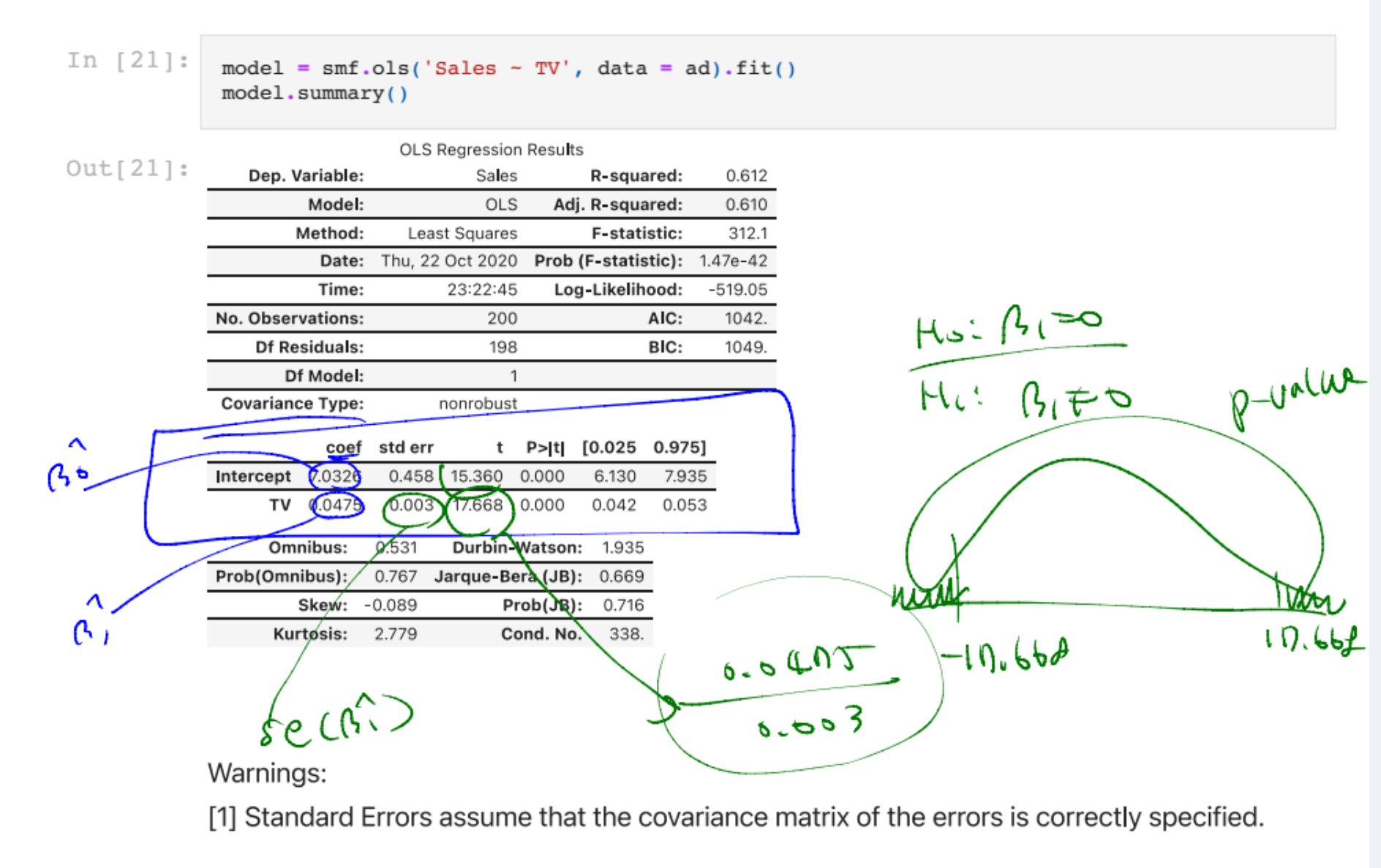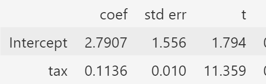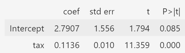 t값은 beta1/ 표준오차 즉 0.1136/0.010 = 11.359 이다.