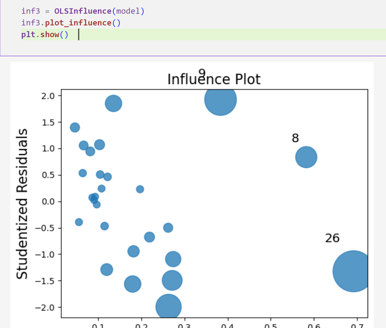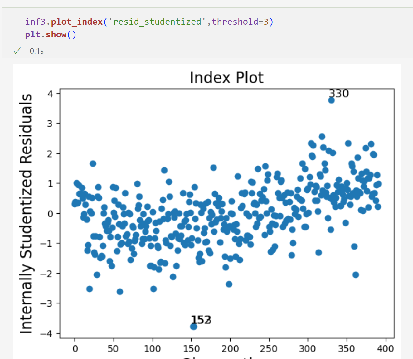 이상치를 구할 때 1_ studentized Residuals로 구한다. (스켈링) 2_ 3보다 크면 이상치라고 한다.