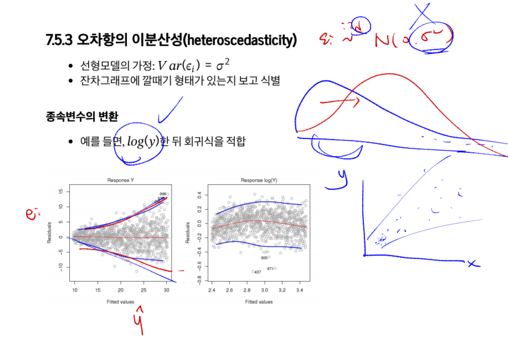 위 그림처럼 등분산성을 위배했을 때 로그변환을 취한다.