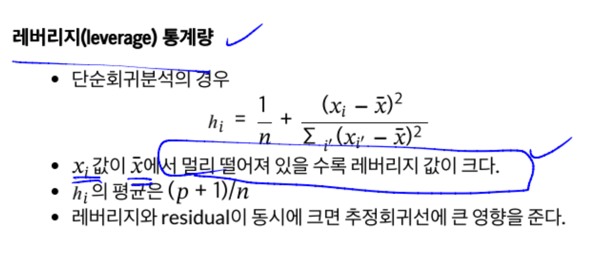 residual이 크고 x 무리에서 벗어났을 때 영향점이 된다. 이런 수치를 표현해주는 것이 Leverage
